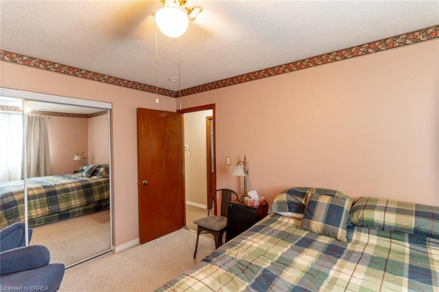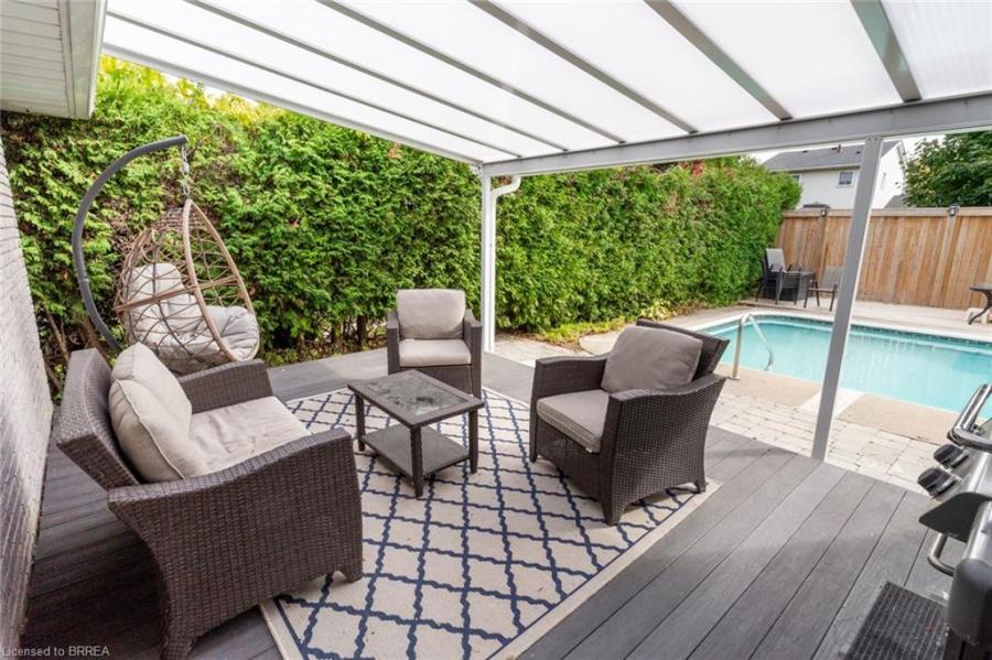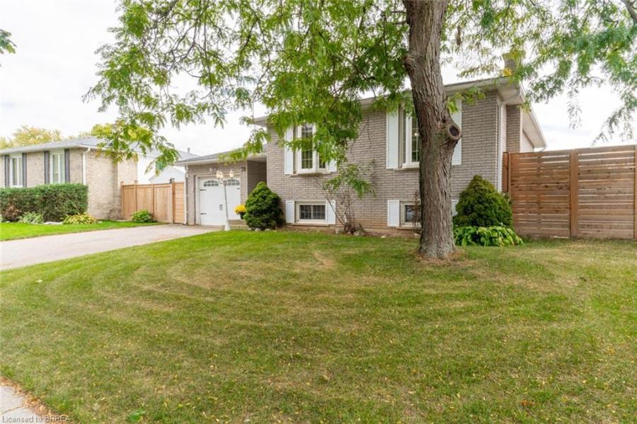 North End all angelstone brick raised ranch style family home with wide 57 ft frontage lot & heated inground pool for summer fun steps to schools! Featuring open concept newer stunning eat-in kitchen, dining room & living room with hardwood floors- perfect for entertaining! 2+1 bedrooms, 2 full baths, could have 4th bedroom on lower level if needed, finished rec room with gas fireplace and built in book shelves with desk, nice covered sun screen deck that blocks UV sunlight, newer windows with 2 bay windows in living room & dining room, newer reshingled roof, furnace, central air, newer insulation, all TV's stay, most furniture is also negotiable, all appliances included, double paved driveway, atttached garage with auto opener, security system, fenced yard. Close to shopping and easy Hwy 403 access just off the Wayne Gretzky Parkway. Room to park RV or trailer on side of home with gravel base. Immediate possession. A Must See!